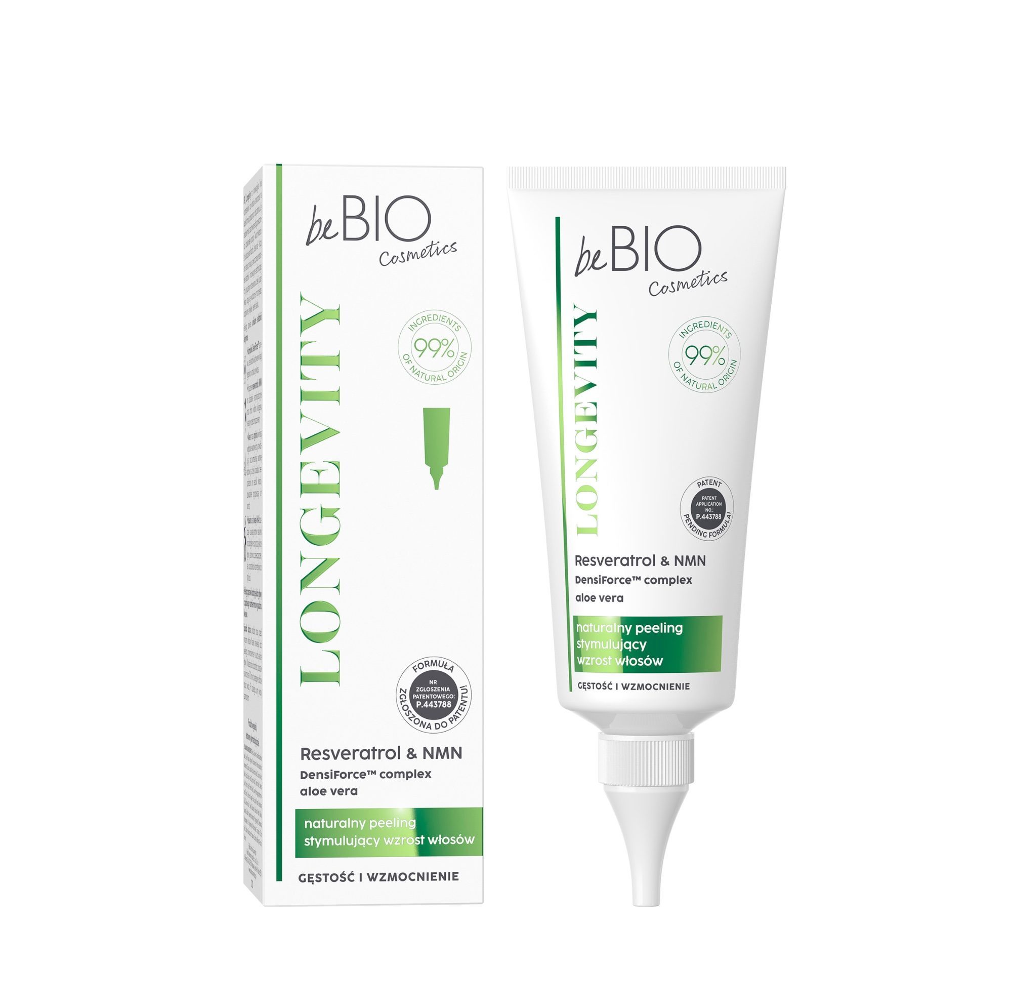 beBIO Longevity juukseid tihendav ja tugevdav peanahakoorija aitab puhastada peanaha mustusest ja ergutada juuksekasvu. 99% looduslikud koostisosad.