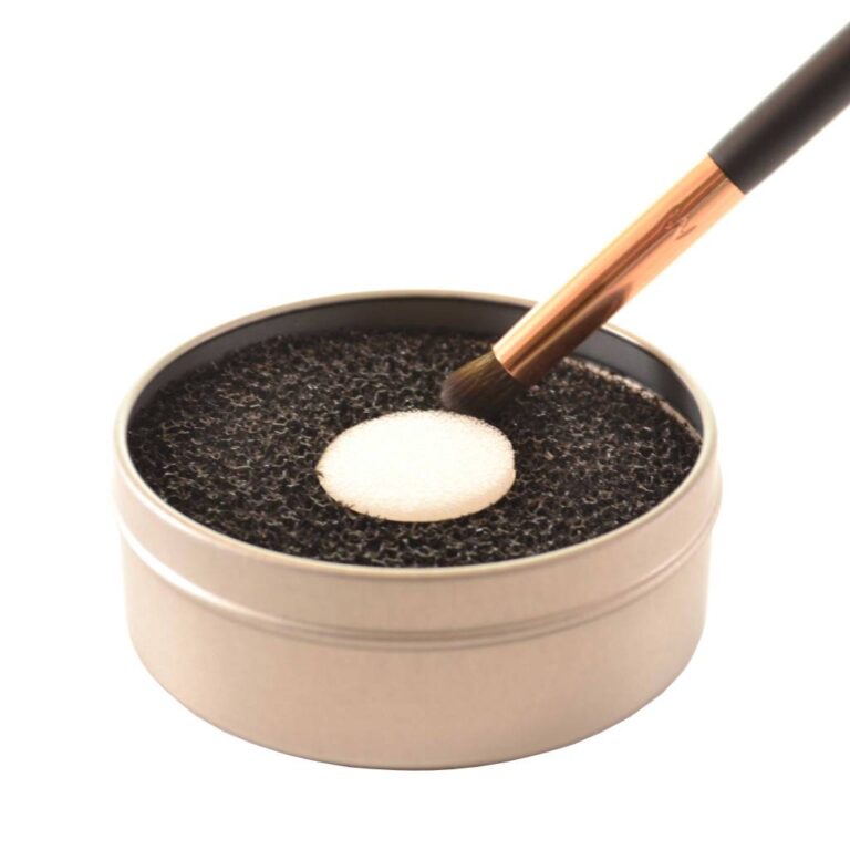 Keskel on valge käsn, kus saate kontrollida, et teie pintsel on 100% puhas. Võite ka käsna niisutada, et muuta oma lauvärvi värv veelgi intensiivsemaks. Kuiva meigipintsli puhastusvahendi käsna saab kasutada mõlemalt pidi ja seda saab pesta, kui see on määrdunud, pärast mida saab seda uuesti kasutada.
